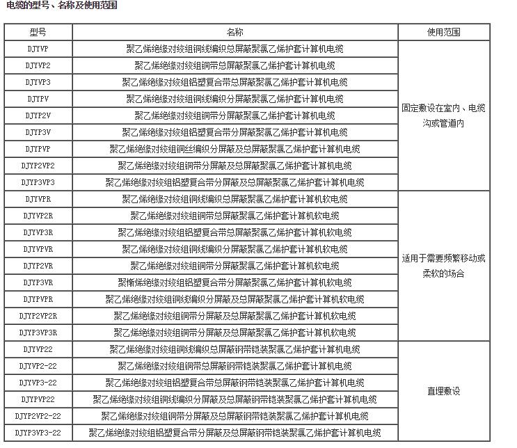 屏蔽材料有圓銅線、銅帶、鋁箔/塑料復(fù)合帶三種。屏蔽對與屏蔽對具有較好的絕緣性能,電纜在使用中若屏蔽對與屏蔽對之間出現(xiàn)電位差時(shí),不會(huì)影響信號(hào)的傳輸質(zhì)量。 計(jì)算機(jī)電纜的型號(hào)、名稱及使用范圍見表。
